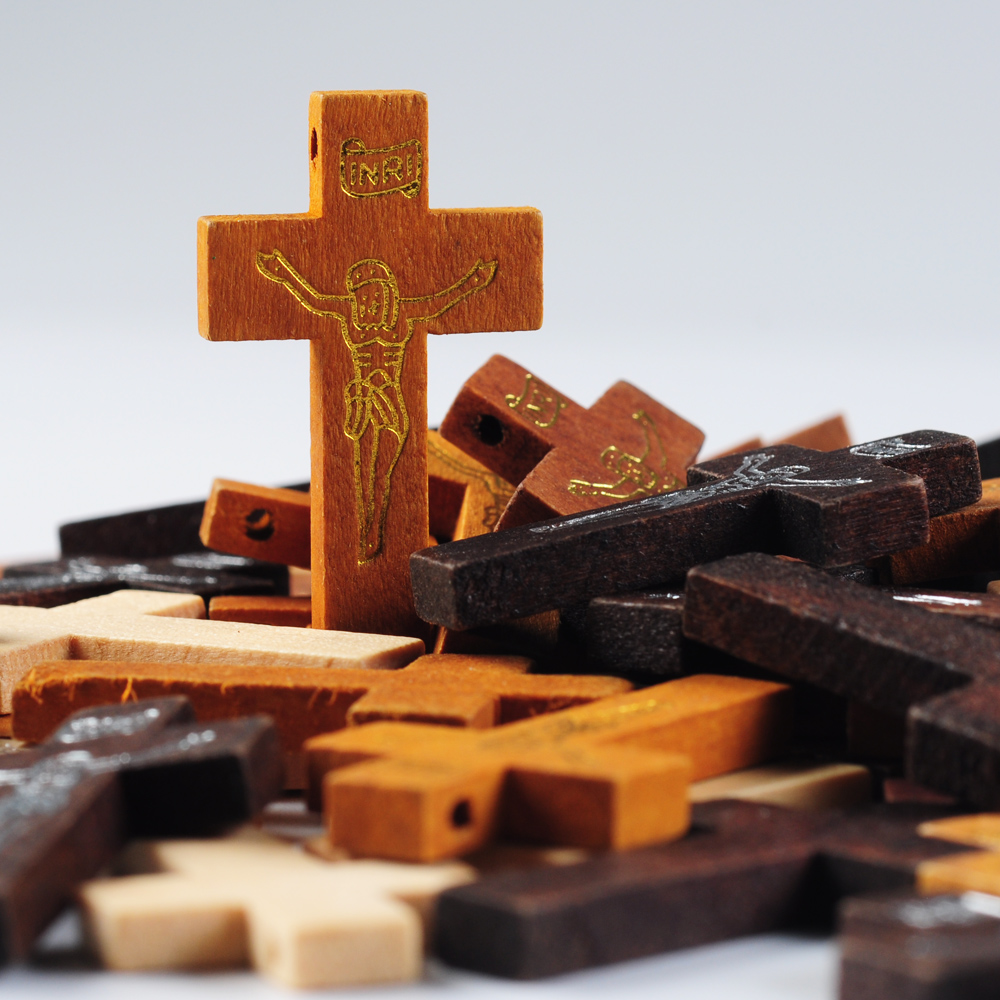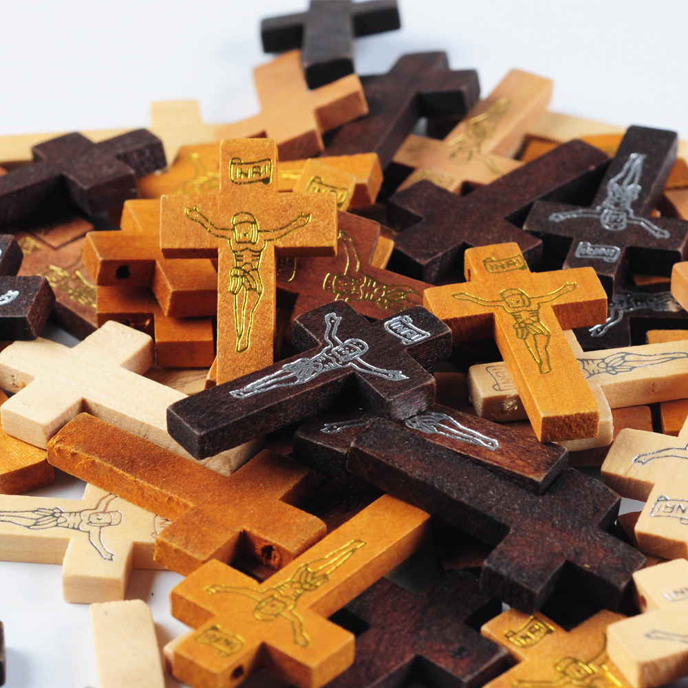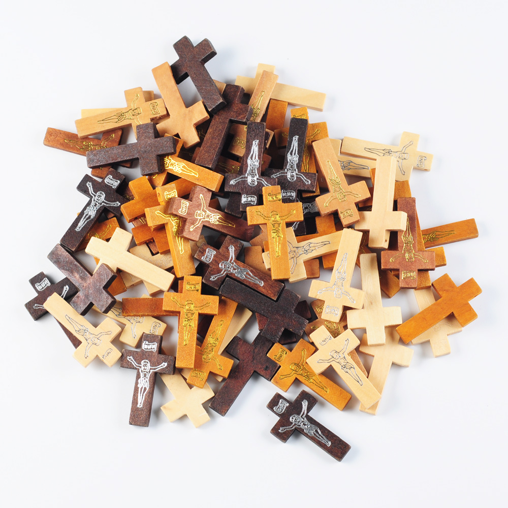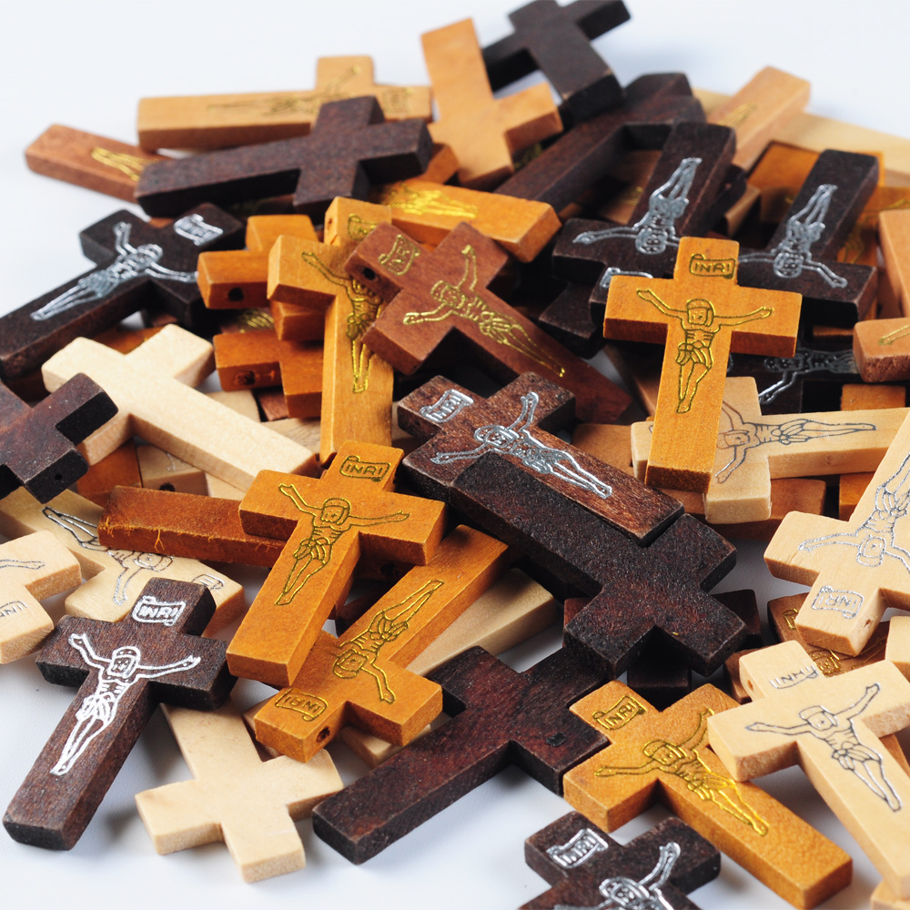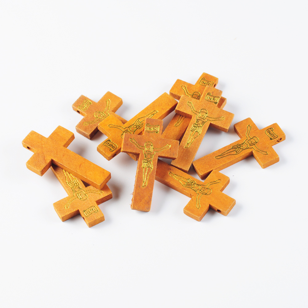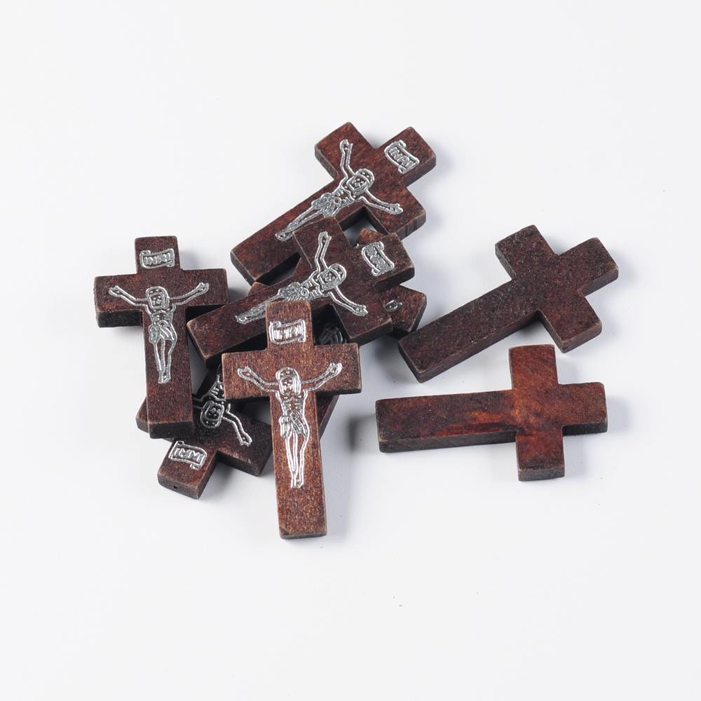 Jesus wood cross, small size wood cross with silver/golden color printing Jesus. with hole on top for threading.